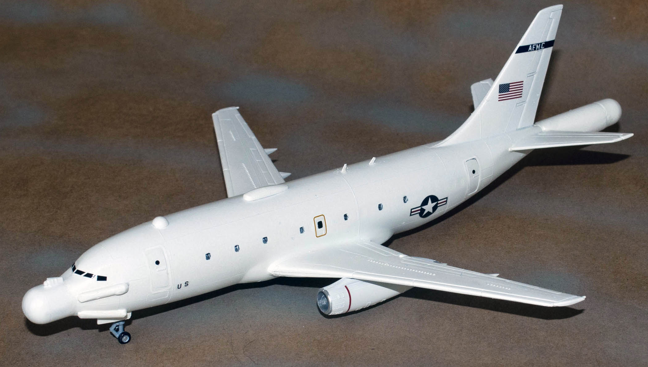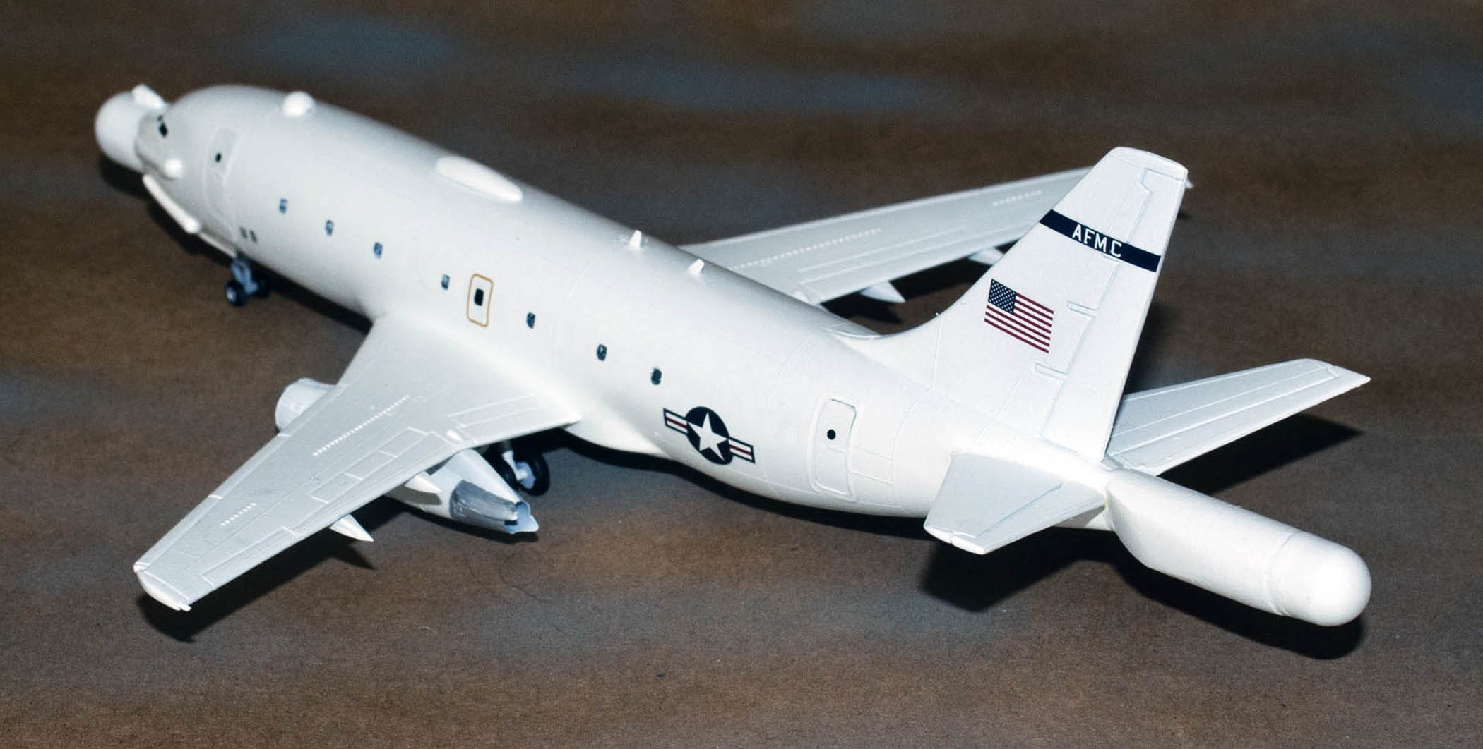 Since the plane didn’t have a lot of markings, I used some U.S. Air Force decals from a previous 144 kit I put together. The U.S. flag was in my spare decal box. I also added some Stars and Bars to the aft fuselage. For the black stripe on the tail, I found some decals that would work. The lettering AFMC is also indicated on the black stripe in the pictures. I found some white alpha decals and added them to the black stripe. The engine had red stripes in the area of the primary fan blade and I found some decals for these items.