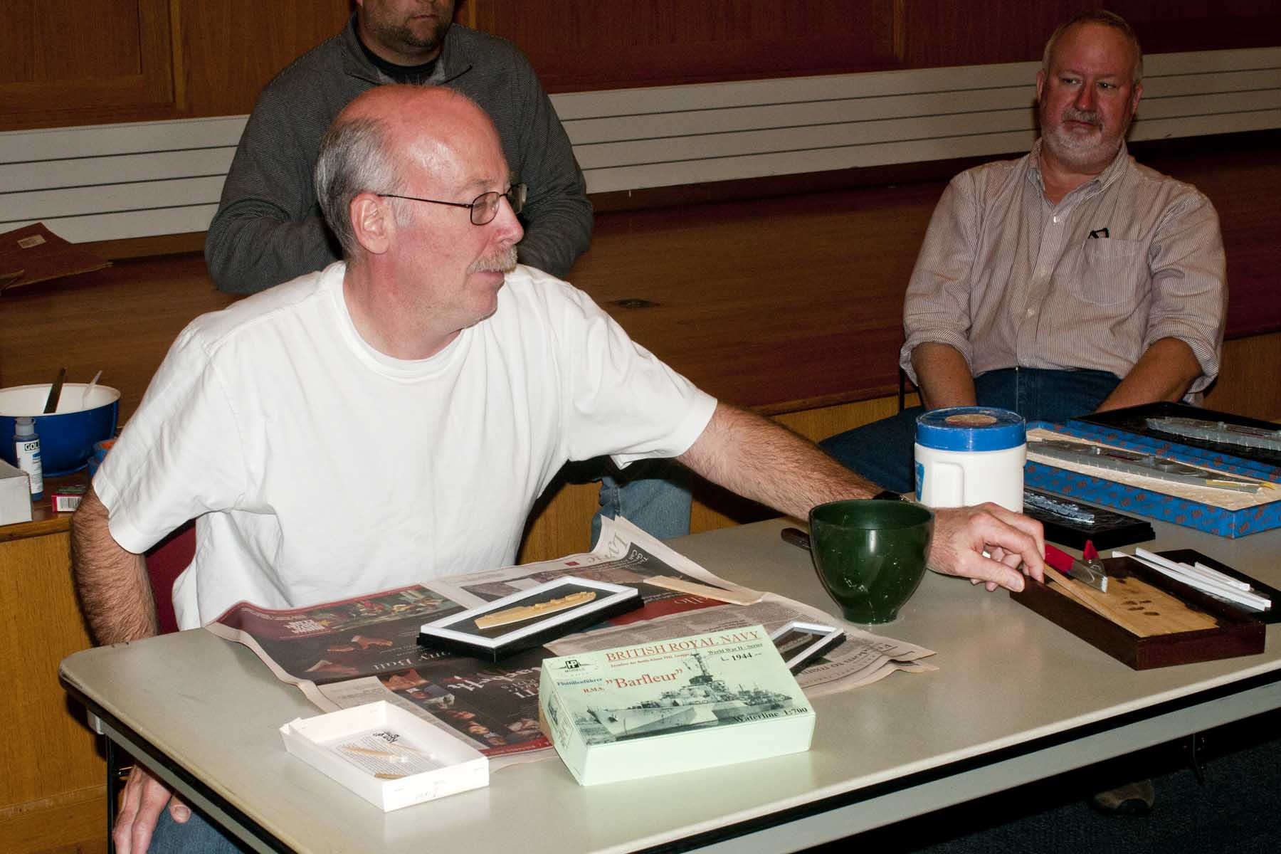 Charlie Scardon did a hands-on demo to show how he makes water for his ship dioramas. For this process, Charlie uses Dental buff stone, which can be bought in some hobby shops that deal in HO gauge trains (Woodland Scenics markets it as ‘Hydrocal’). Or, if you know “dental” people like the 2 technicians or dentist who are members of McK, you have an alternate source! It’s a harder material than plaster of Paris, and a bit less porous. Working time is usually about 20 minutes – give or take… Charlie will show his painting technique for water at the November meeting.