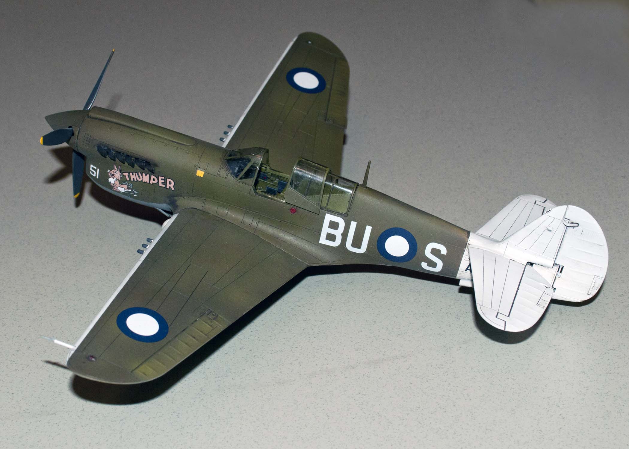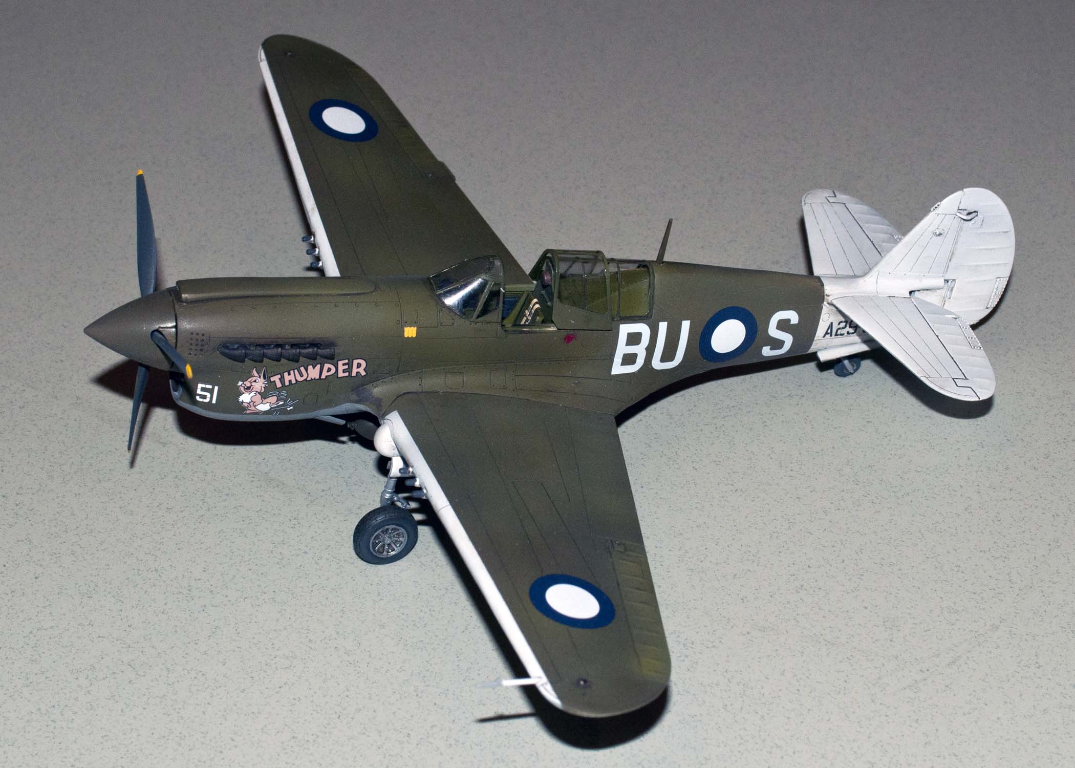 Markings for No. 80 squadron, RAAF Noemfoor, 1944. Lt John N. Ollivier. Paint: Gunze Olive Drab 1 (H52) and Tamiya white, Neutral Gray. Decals are DK, a Czech Republic decal Mfr.