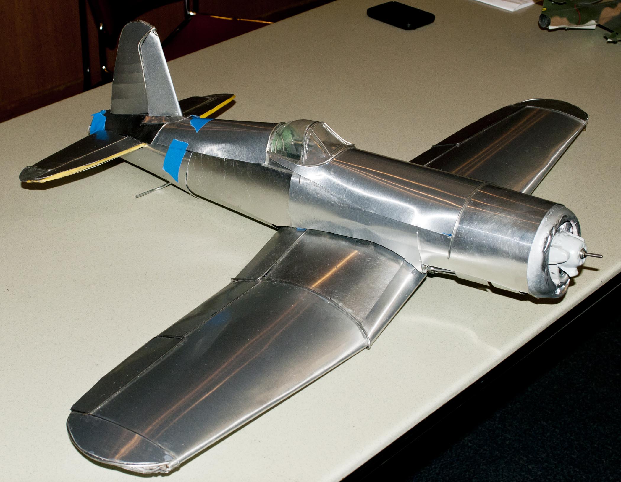 John Sr. is working on this Gulliows wood and tissue Corsair model – he is replacing the standard tissue or balsa skin with metal.