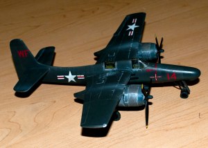 Scratch built radar operator compartment (seat, instrument panel, etc.) and nose wheel well. The rear canopy was vac formed over a plaster mold. The nose from canopy forward is a custom vac formed piece. Replacement props are Aero Club with square tips.
