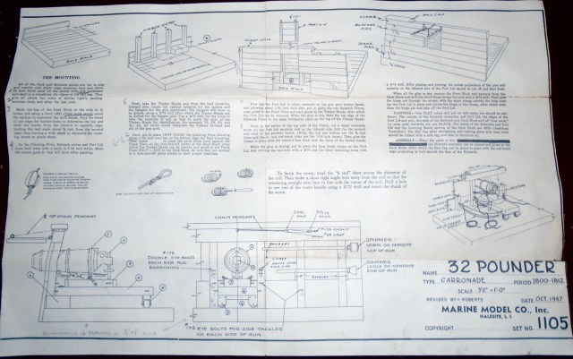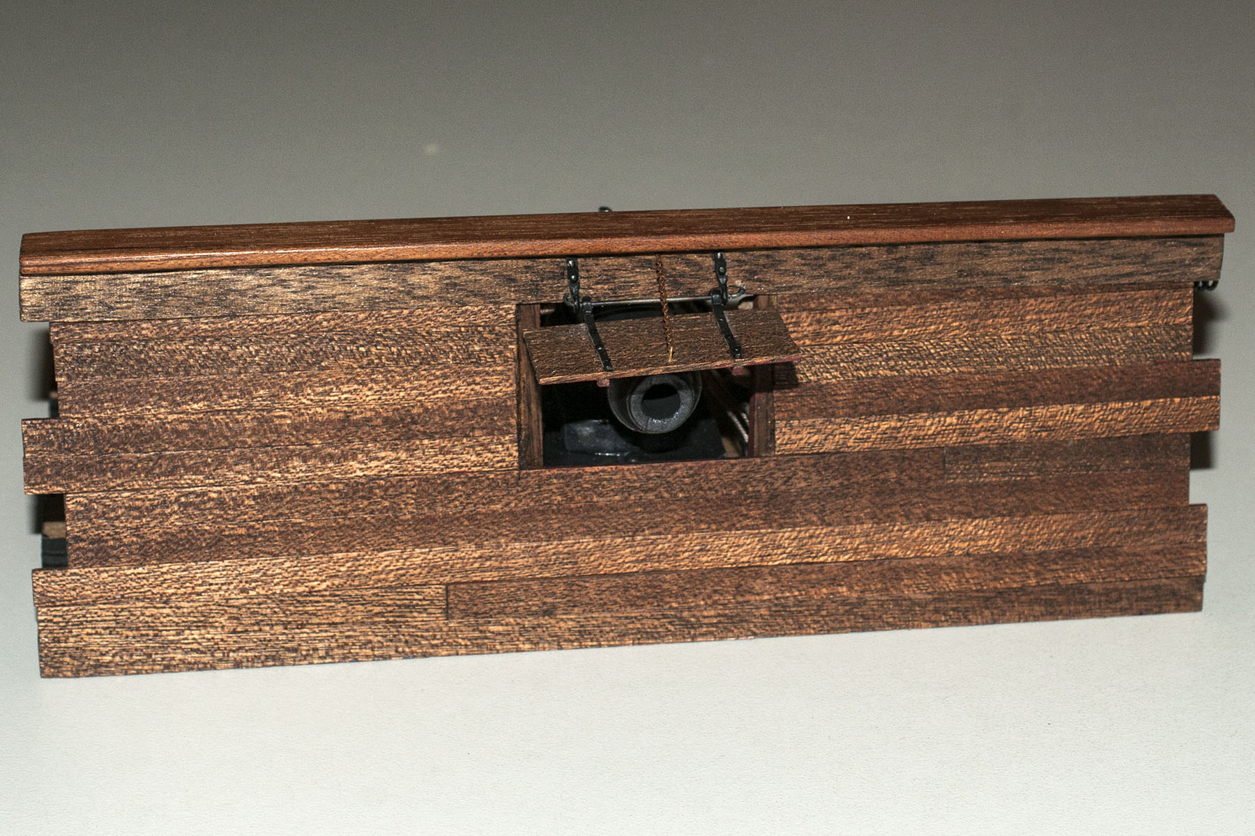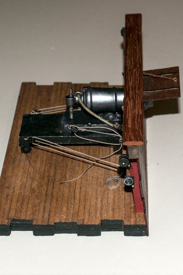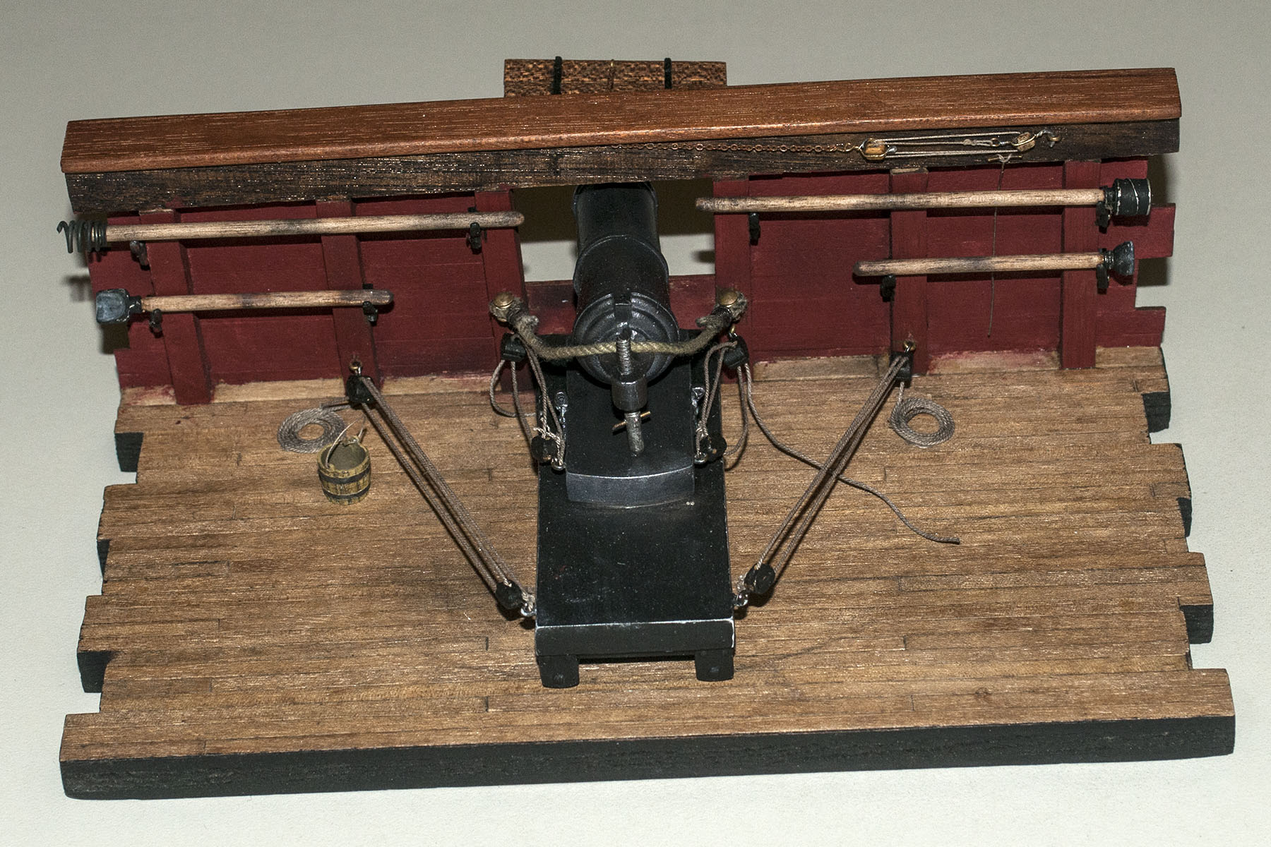 Marine Models USS Philadelphia 32 pounder Carronade. I won this kit (sight unseen) in an auction with a high bid of $20. The kit is from 1947, a 70 year old unassembled wood and cast metal kit. The base was a piece of plywood that the instructions said to draw lines to simulate deck planks. The bulwarks were were three pieces of mahogany which also were to have pencil lines to portray individual planks. Knowing that this would not produce a quality representation of a deck section, I raided my scrap wood collection and found 5/32″ x 1/32″ basswood and some 3/8″ x 1/16″ mahogany and scratch built the deck and bulwarks. Two of the 8 cast metal pieces used for hanging the tools were broken, so I made a RTV silicone mold of two intact pieces and made cast resin duplicates with dye added to the resin to make them match the others. The cannon and its platform were epoxied together and painted with Tamiya gunmetal from a rattle can. All other metal parts were painted flat black. The inside bulwarks were painted a dark red custom mix of Testor Acryl paints and the deck and bulwarks were stained using Minwax Golden Oak & Red Mahogany. The scale ropes are from Syren Ship Model Company. The handrail has no finish other than being sanded down with progressively finer sandpaper from 1,500 to 12,000 grit, giving it a nicely polished look and feel.