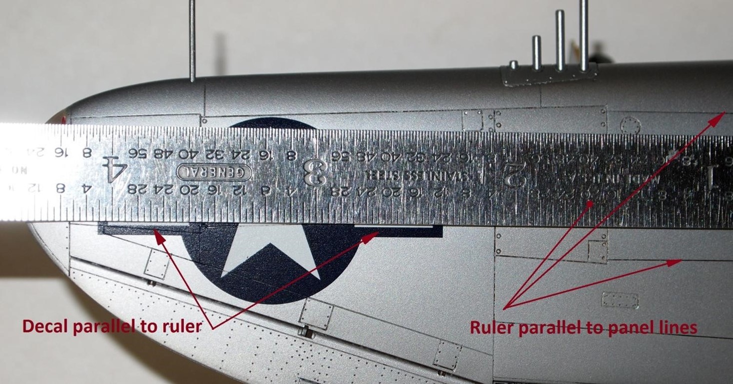 When the decal must be parallel to a feature or marking on the model, in addition to looking at the decal perpendicular to the surface, look at it at a highly acute angle (almost along the surface) to see if it still looks parallel. If I really feel my eyes are playing tricks on me, I’ll use a draftsman’s dividers to double check each end.