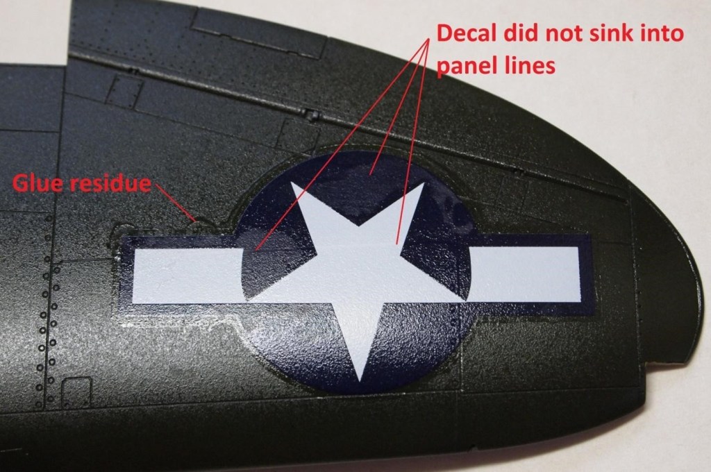 Photo showing a trapped air bubble under the decal. Also note how the decal now has sunken into the panel line after Sol and back dragging the scribing tool.