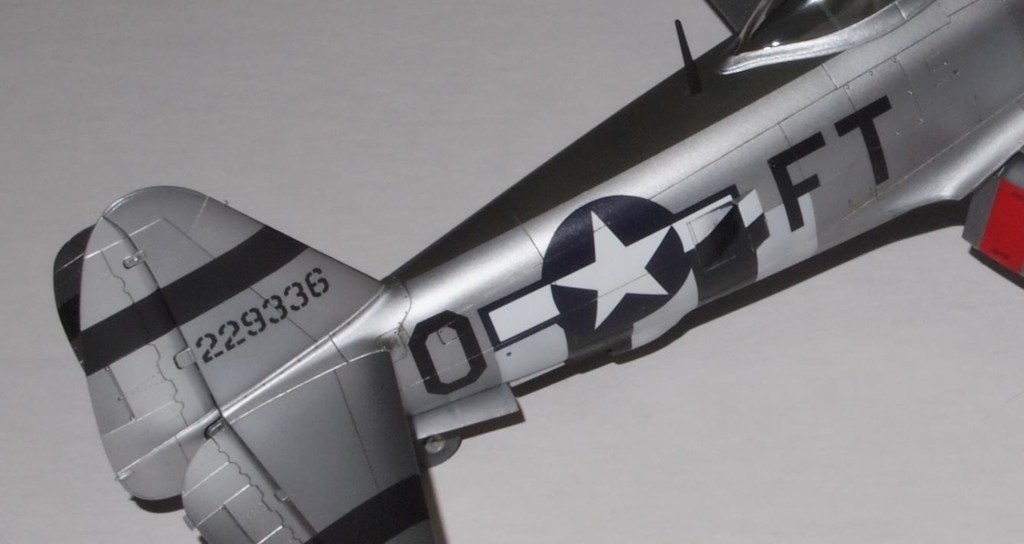 On this model of Dahlberg’s Thunderbolt, there was a fair amount of clear film in the code letters on the Super Scale decal sheet. I used a Waldron hole punch to clean out the clear film in the center of the “O”. I also cut apart the “FT” to remove most of the clear film between the “F” and the “T”. More care was needed to align the “F” and the “T”, but I found that much easier than dealing with silvering under the clear film.