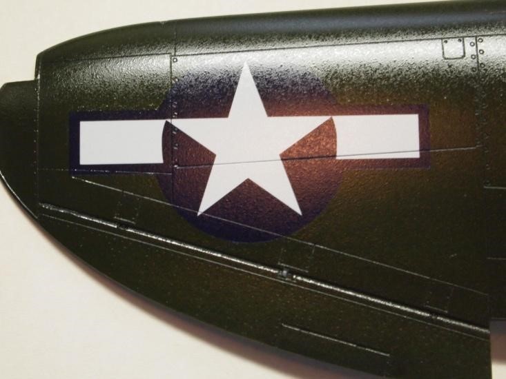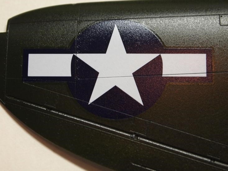 An underside insignia on P-47s creates another bump issue. The identification lights must be painted and one of them always falls inside the insignia. The light rims are raised and don’t create much of an issue, but getting a sharp circular edge for the light can be a slicing frustration.