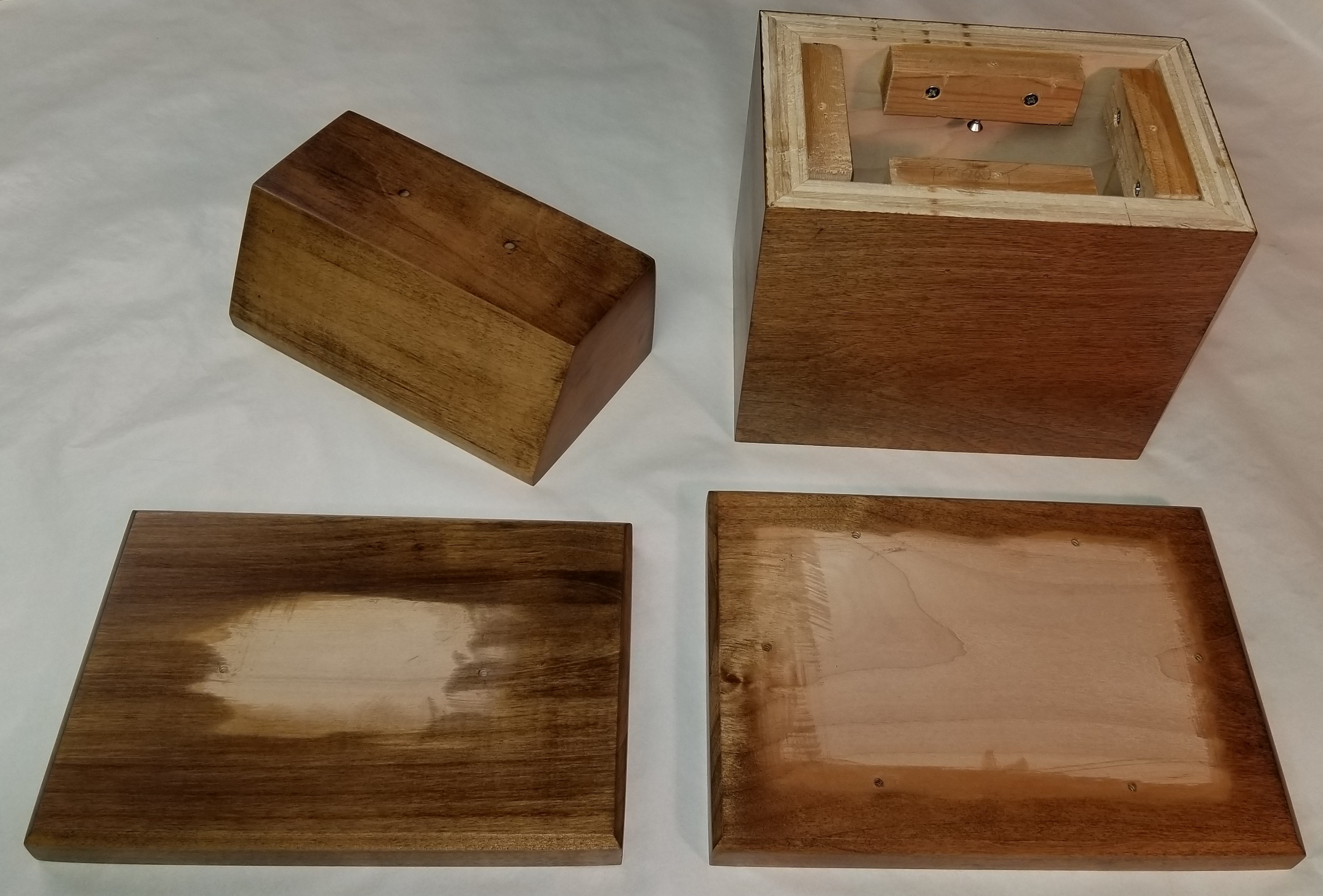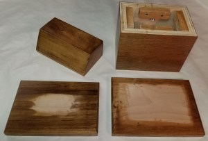 Once I decided to make the figure, the rest seemed straightforward. I’m a woodworker, too. I had pieces of nice wood on hand that I thought I could use. I had some finish plywood scraps I’d scavenged from someone’s cabinet installation to make a basic box. I had pieces of hardwood board I could use to make the top and bottom of the base. (After making the original parts for the base, I didn’t like the way the grain of one piece matched the rest, so I did end up buying another board that looked better.)