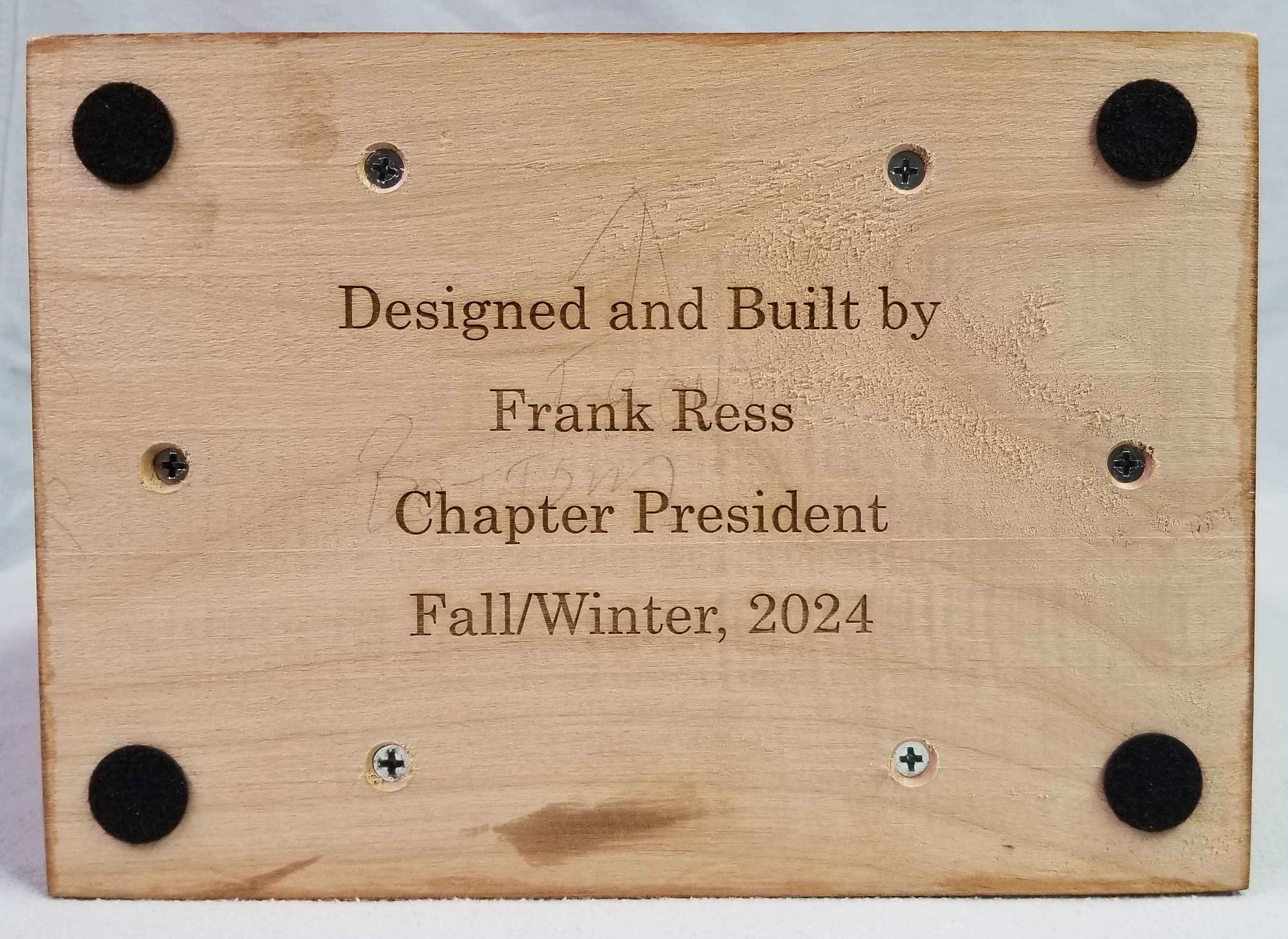 They also sell small table-top shears and punches to work with the sheets of materials. This kind gentleman cut 3 sheets for the title plate, and a couple of dozen pieces for the winner plates. And he punched screw holes and gave me a handful of small wood screws to attach them! I’m now lobbying our library to purchase the tools to work with the sheet stock, to allow others to use the laser cutter for similar projects.