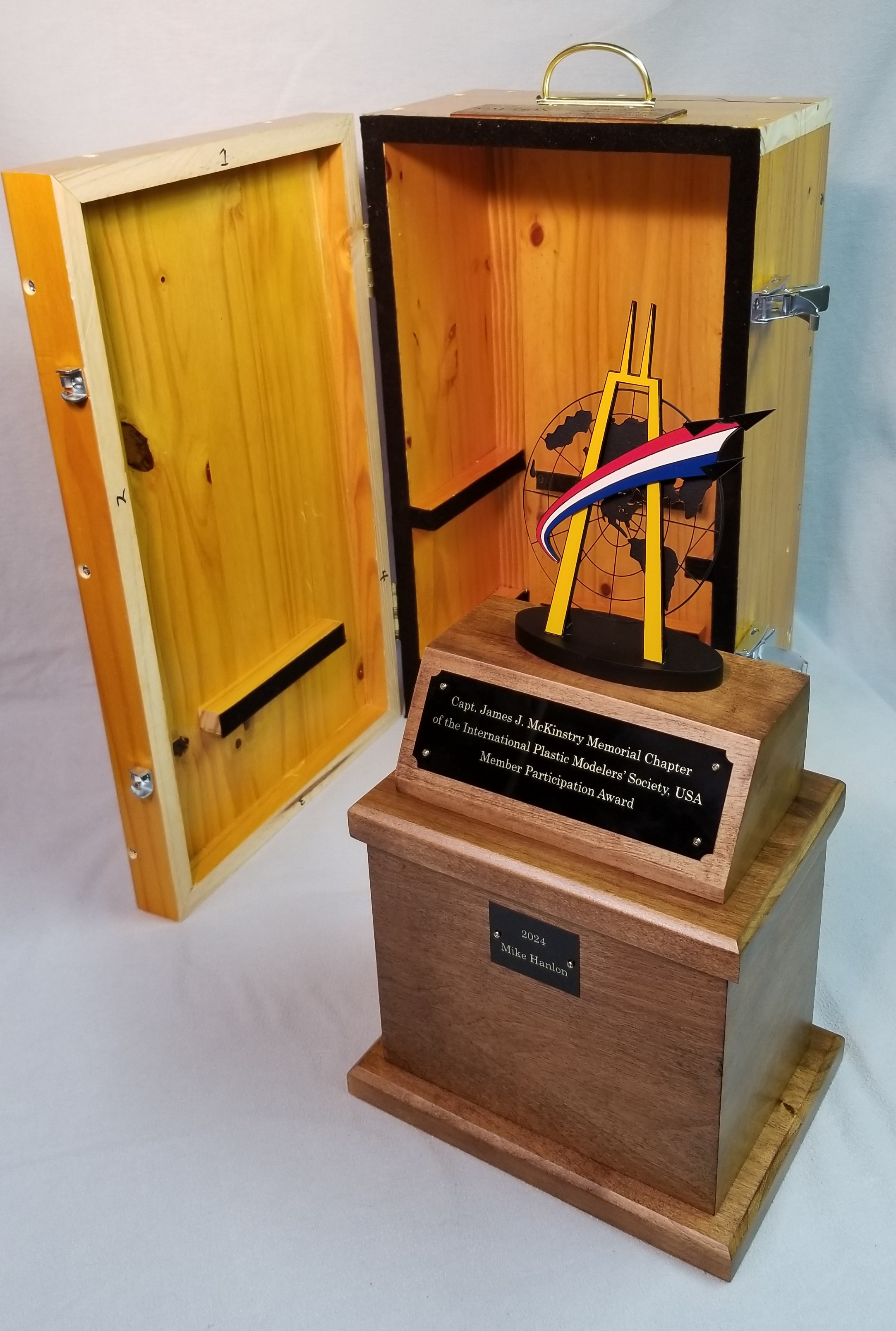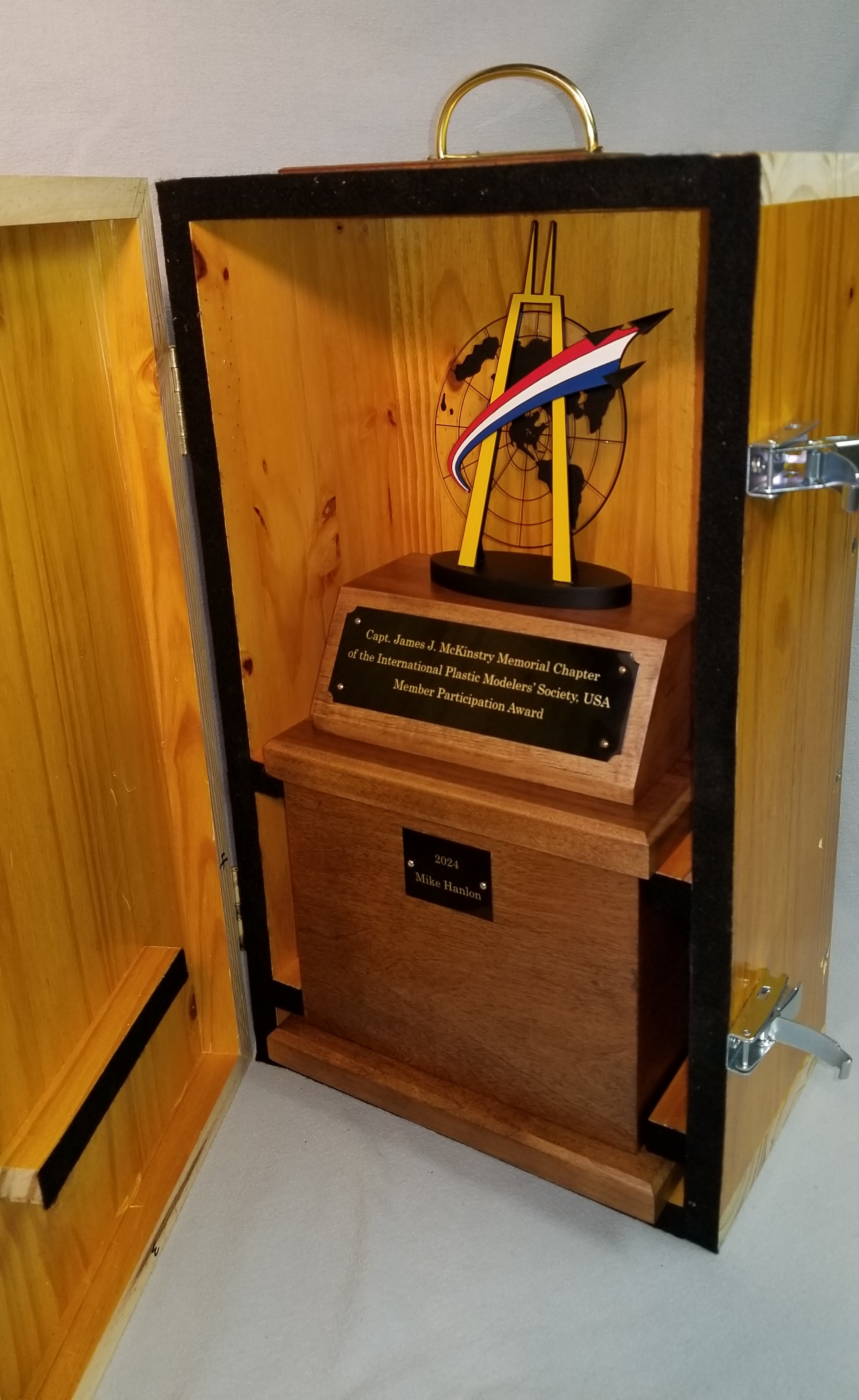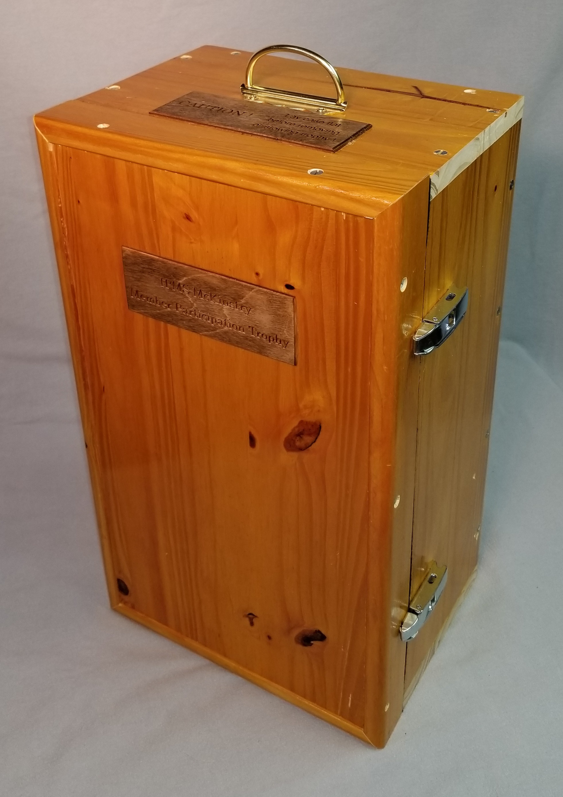 I concluded that the travelling trophy would require a travel case. I had a pine countertop that I’d removed from the basement, so I cut pieces from it to make the travel case. A couple of hinges and some other hardware and it was ready to go.