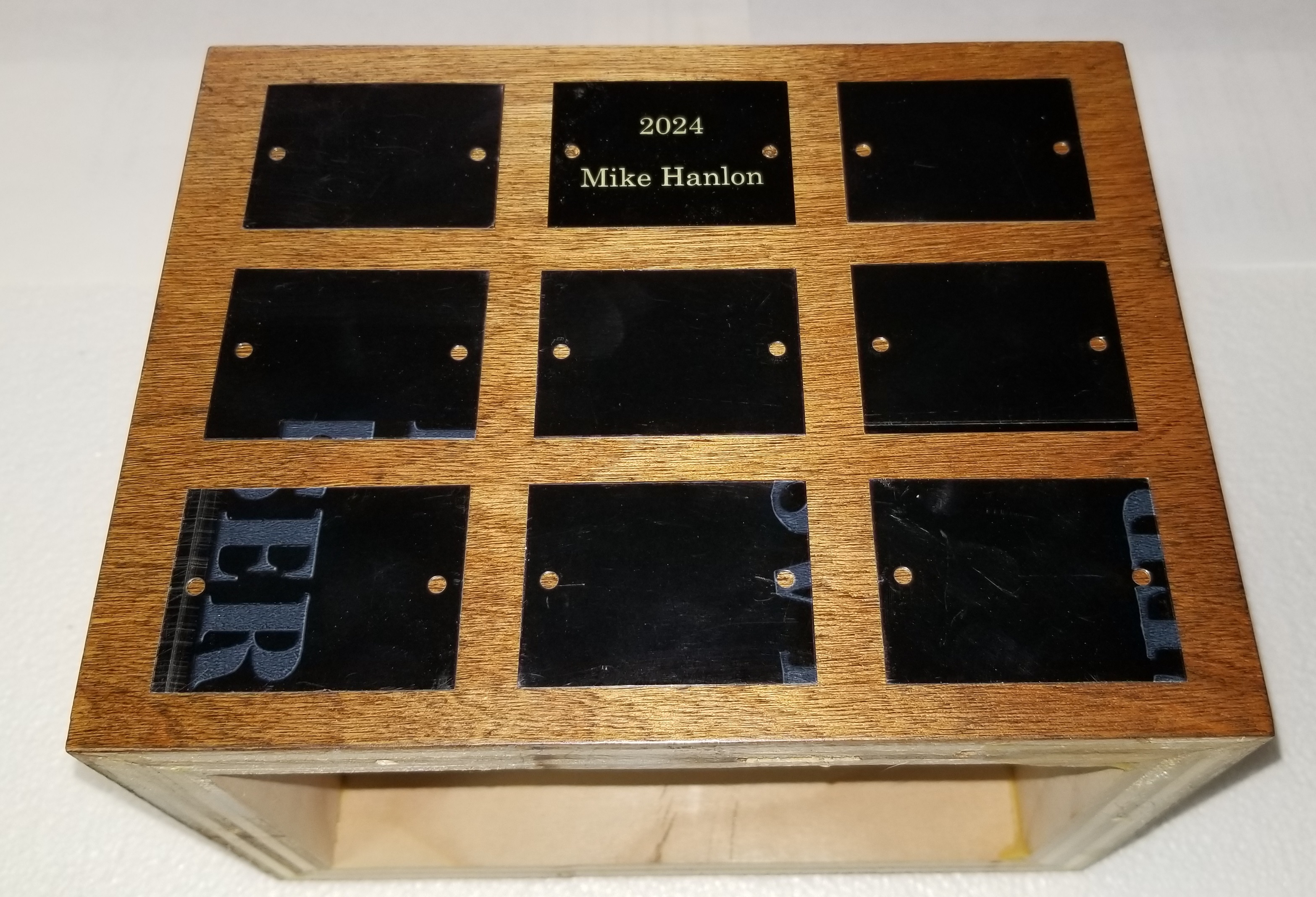 Fig. 1 shows the finished components that make up the base of the trophy. Fig. 2 shows how winner nameplates would be distributed on the front of the trophy. The sides could accommodate 6 nameplates each, so if all 4 sides are used the trophy could recognize 30 years of winners without modification. If this program continues for longer than that – let’s hope so, but I won’t be around to see it – a 2nd tier could be added beneath the existing base. I chose to use screws to attach the winner plates, rather than adhesive, to allow plates to be relocated. That way, the most recent winners can be kept on the front face.
