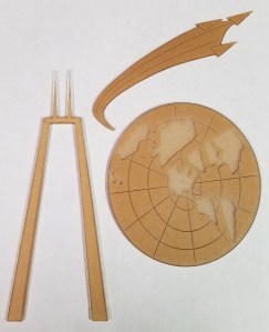 Fig. 6 shows all three elements after they were cut and etched, Fig. 7 shows the painted map with some of the masking removed. I used the Dremel machine for most of my work, since it had more basic capabilities than the Epilog, but was sufficient for my purposes. Demand for the Epilog made getting time on it more difficult.