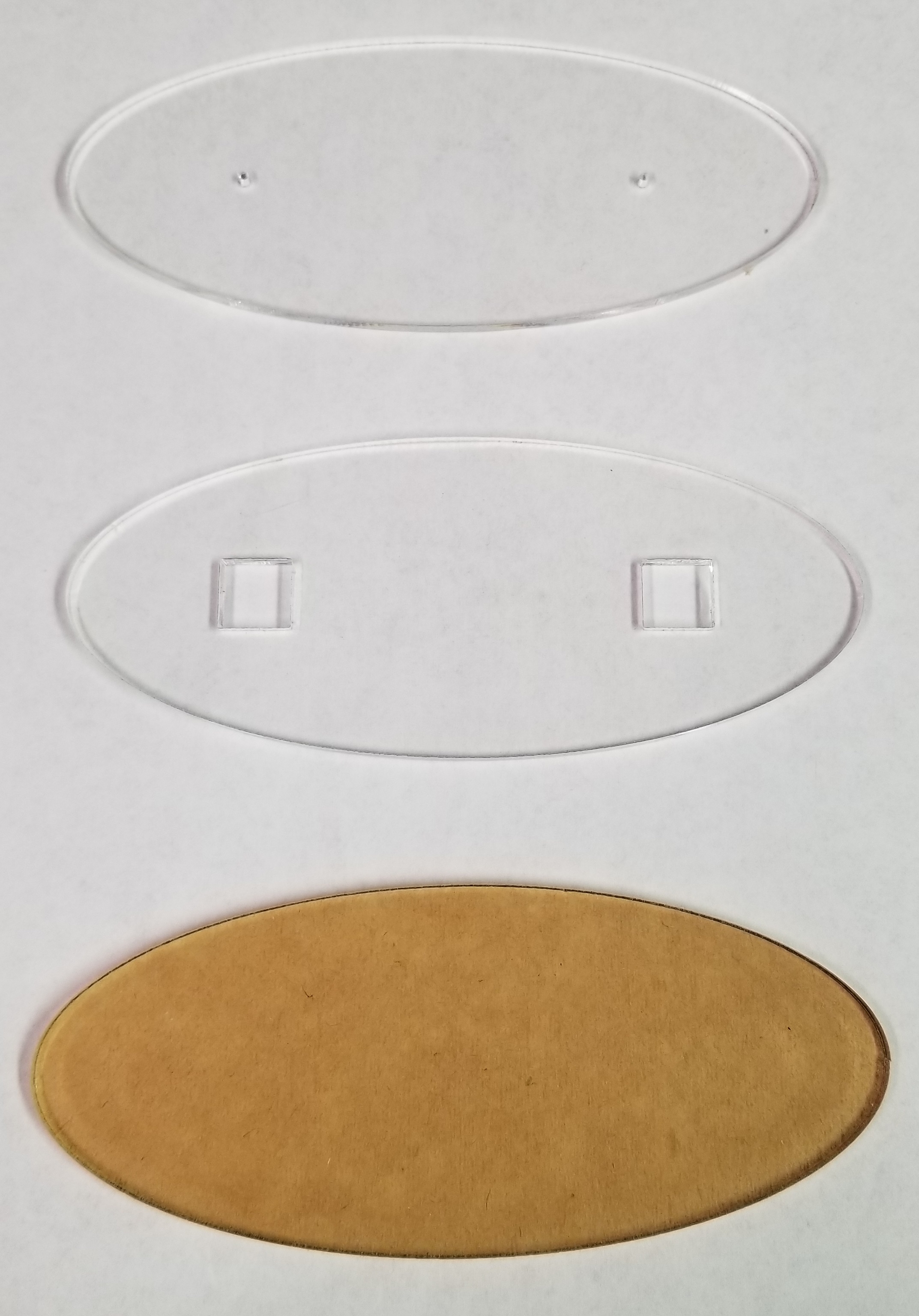 I designed a set of 4 elliptical pieces that would be stacked to make up the base (Fig. 8). I cut these on the laser from 1/8 inch acrylic. I had the laser cut 2 square holes for a pair of old, 4-sided nuts in one piece. This layer was sandwiched between 2 with holes cut just larger than the machine screw that matched placement of the nuts. When all the layers were glued together, the nuts were captured, but allowed to ‘float’ within the opening, to allow the screws to self-align. The reason for the holes in the layer above the nuts was to allow the screws to protrude through the nut layer without putting strain on the joint with the top layer. The top layer was solid, and the figure would be attached to this (Fig. 9).